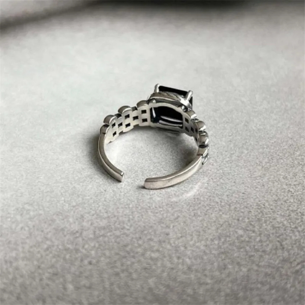 Son design élégant met en valeur une pierre noire taillée en carré, symbole de force et de mystère. Son éclat profond contraste magnifiquement avec la brillance argentée de l’anneau, créant une harmonie visuelle unique. La monture tressée apporte quant à elle une touche artisanale et sophistiquée, tout en assurant un confort optimal grâce à son ouverture ajustable.