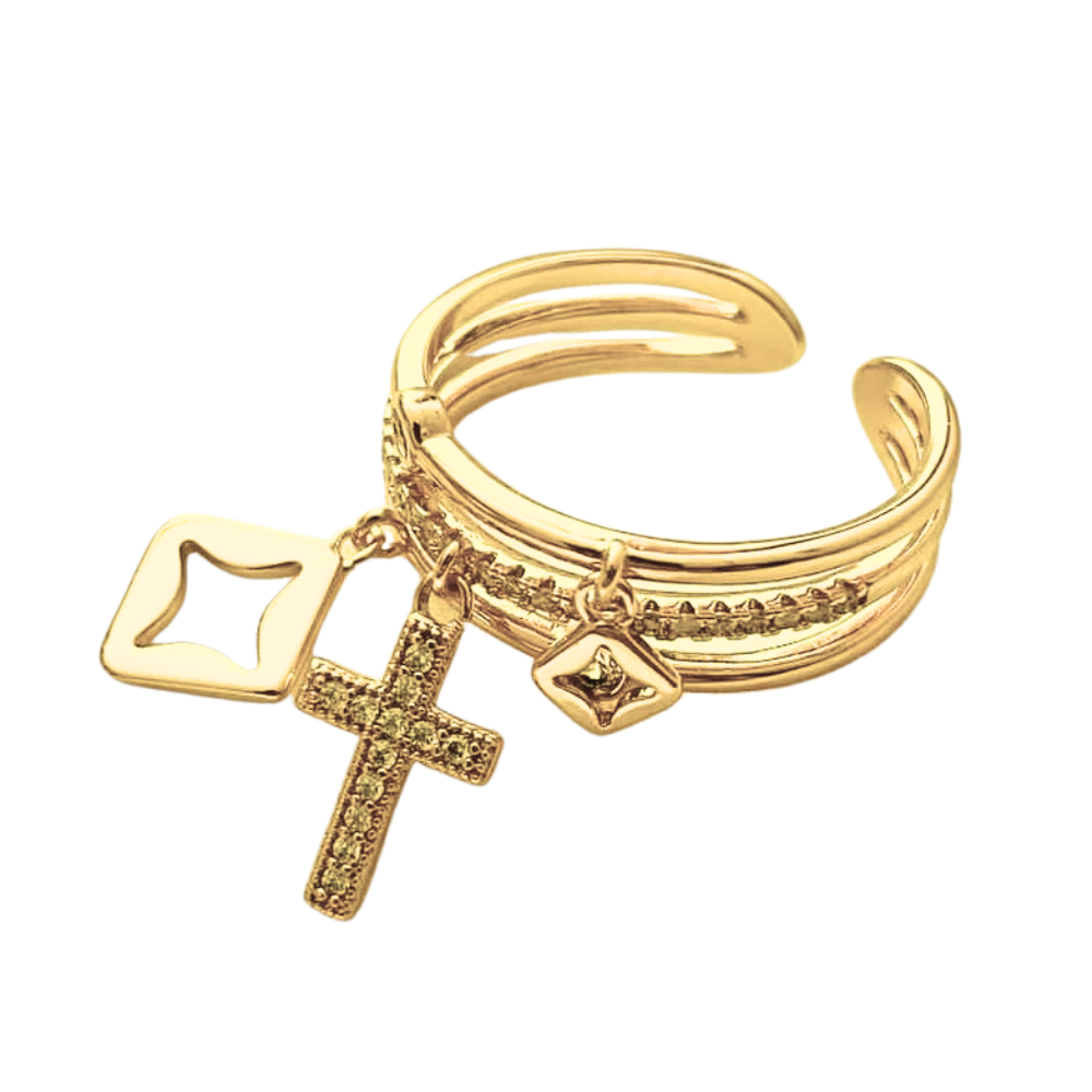 Misez sur le charme bohème avec notre adorable bague dorée ornée d'une breloque croix et losanges. L’anneau triple affiche une série de petits cristaux délicatement alignés sur la partie centrale. Les trois breloques dorées, dont une croix incrustée de cristaux, apportent un mouvement à chaque geste.
