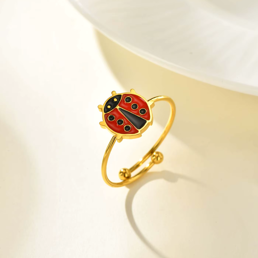 Cette bague en acier inoxydable doré représente une coccinelle en relief sur un anneau ouvert. Son design fin et discret met en valeur un petit insecte porte-bonheur avec une touche dorée et rouge. Facile à porter et ajustable, elle convient à toutes les tailles de doigts.