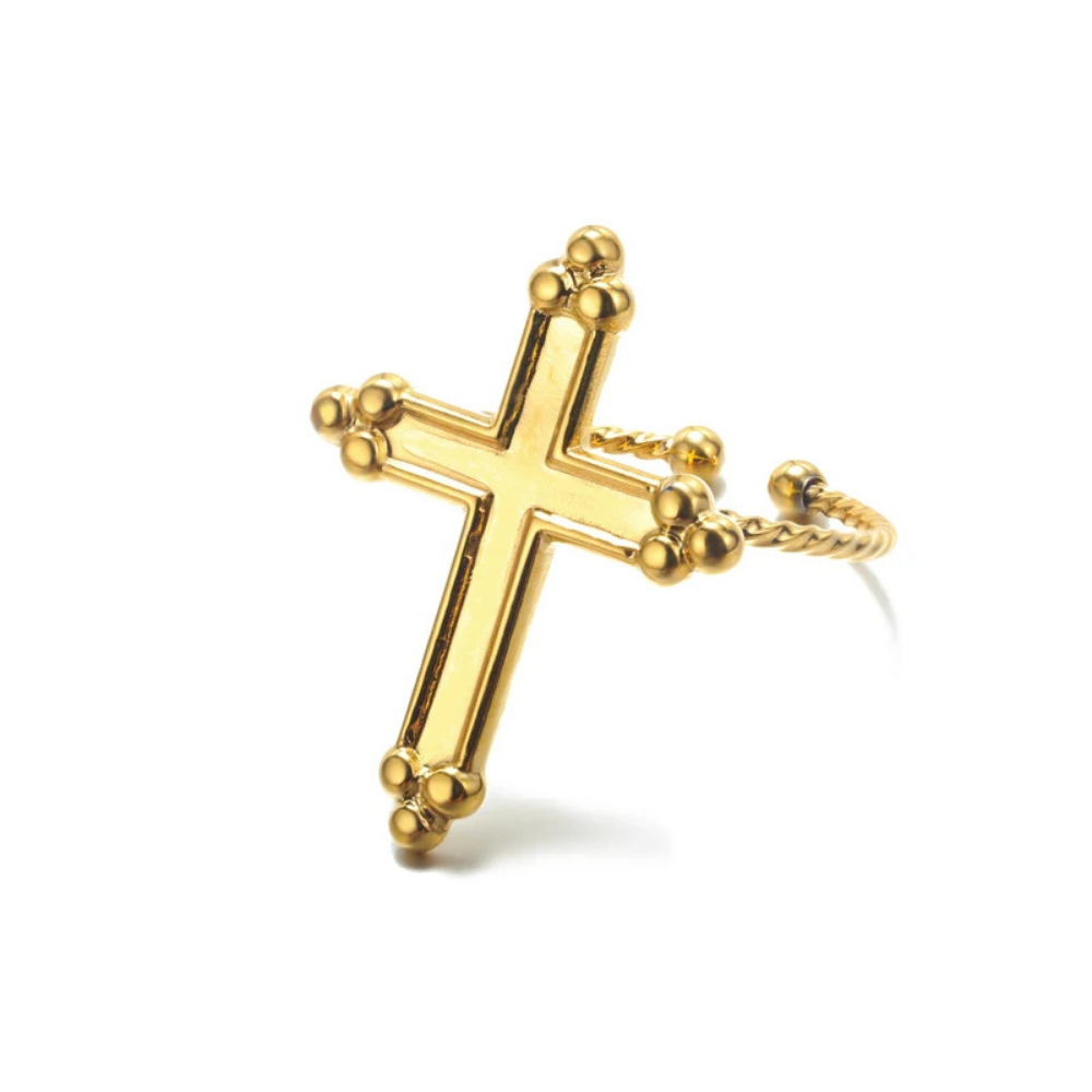 Laissez-vous séduire par notre sublime bague croix imposante style ancienne, montée sur un anneau torsadé. Son design en acier inoxydable doré lisse est accentué par des extrémités arrondies, façon perles, aux quatre coins de la croix. L’anneau, finement spiralé, ajoute du caractère à l’ensemble. Son contraste entre lignes droites et volumes ronds attire l'œil dès le premier regard.