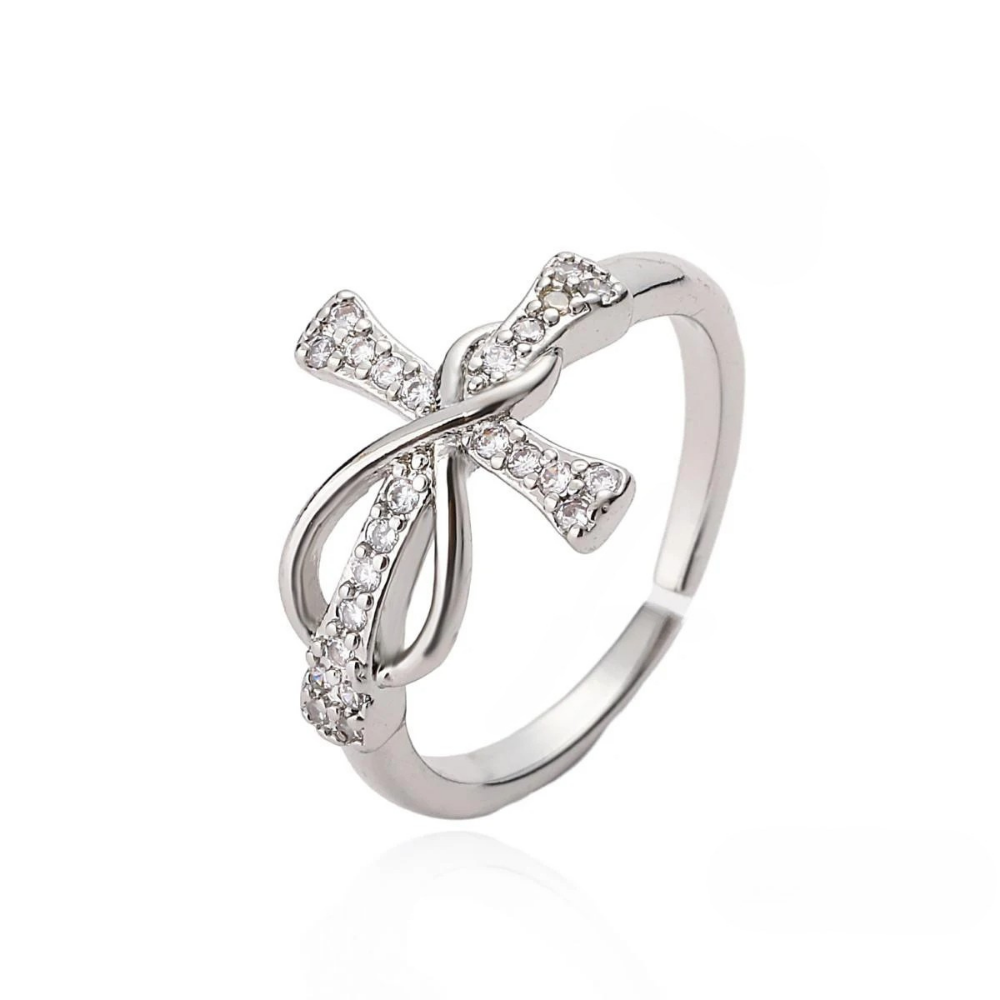 Laissez-vous séduire par notre mignonne bague avec signe infini entrelacé autour d'une croix scintillante. La croix centrale légèrement courbée est entièrement recouverte de cristaux brillants. Deux fins anneaux entrelacés se croisent délicatement autour de la croix, ajoutant un effet super élégant. Sa taille est ajustable.