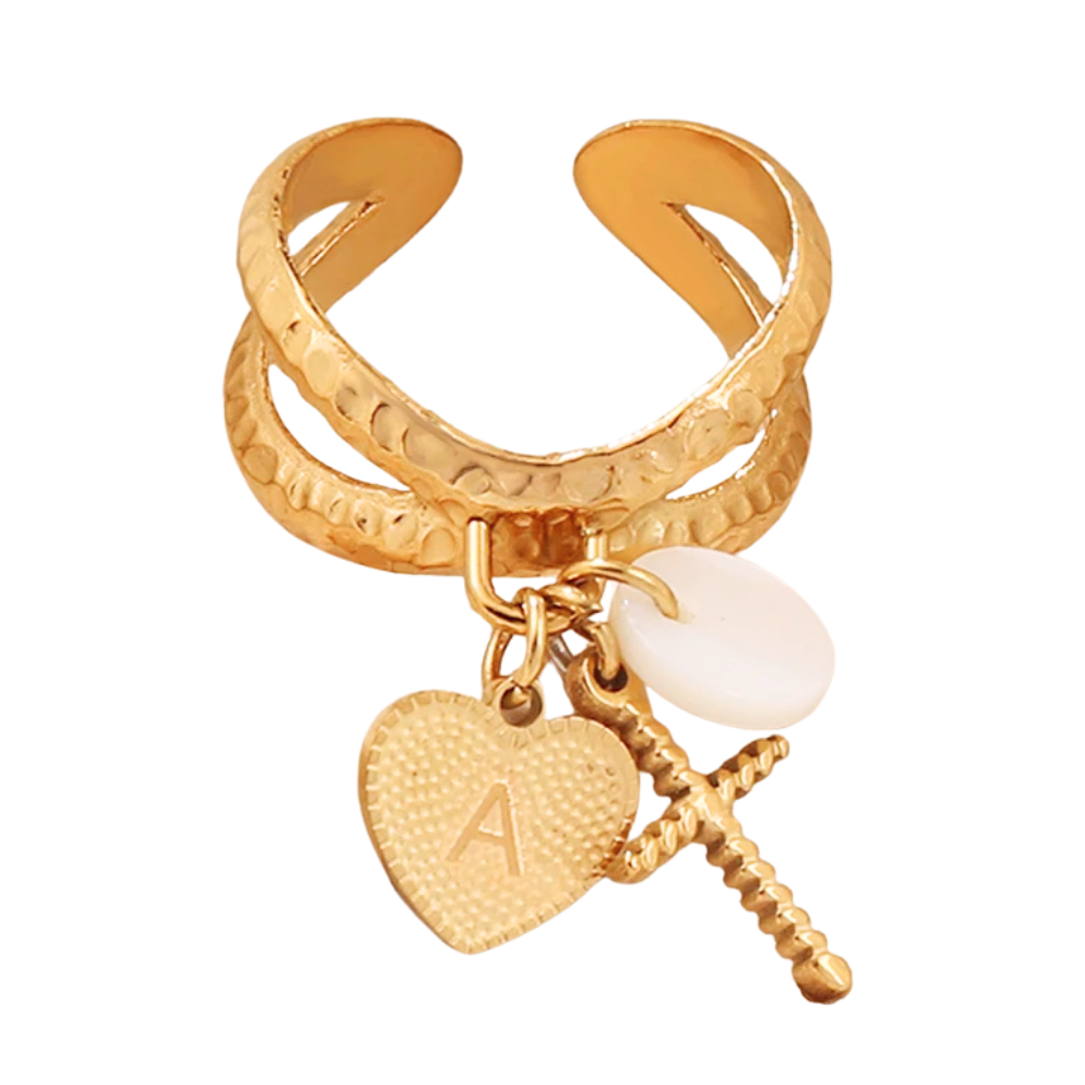Avec ses breloques pendantes, notre magnifique bague avec pendentif croix et initiale se distingue par ses détails symboliques. Deux anneaux texturés superposés forment une base solide. En pendentifs : un cœur marqué d'une lettre, une croix en relief torsadée et un petit disque blanc nacré. Chaque élément ajoute du caractère à cette pièce pleine de symboles.