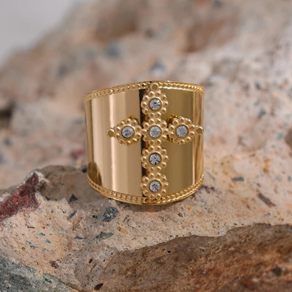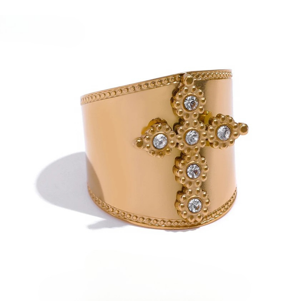 Affirmez votre style avec notre ravissante bague manchette dorée ornée d'une croix sertie de pierres cristallines. Sa surface lisse et brillante contraste avec les détails délicatement embossés sur les bords. La croix centrale est décorée de motifs perlés et incrustée de six cristaux transparents étincelants. Sa structure imposante habille avec élégance tout doigt.