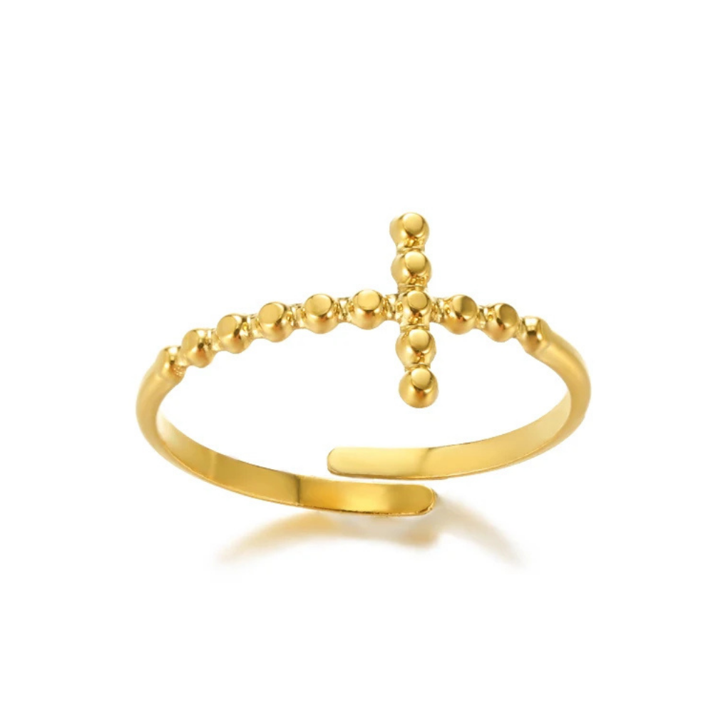 Légère, fine et singulière : notre élégante bague croix style minimaliste, séduit par sa simplicité originale. La croix, formée de petites sphères parfaitement alignées, semble flotter sur un anneau semi-ouvert. Le bijou en acier inoxydable doré s’adapte facilement grâce à sa conception réglable, tout en offrant un effet wouaw avec son motif perlé uniforme.