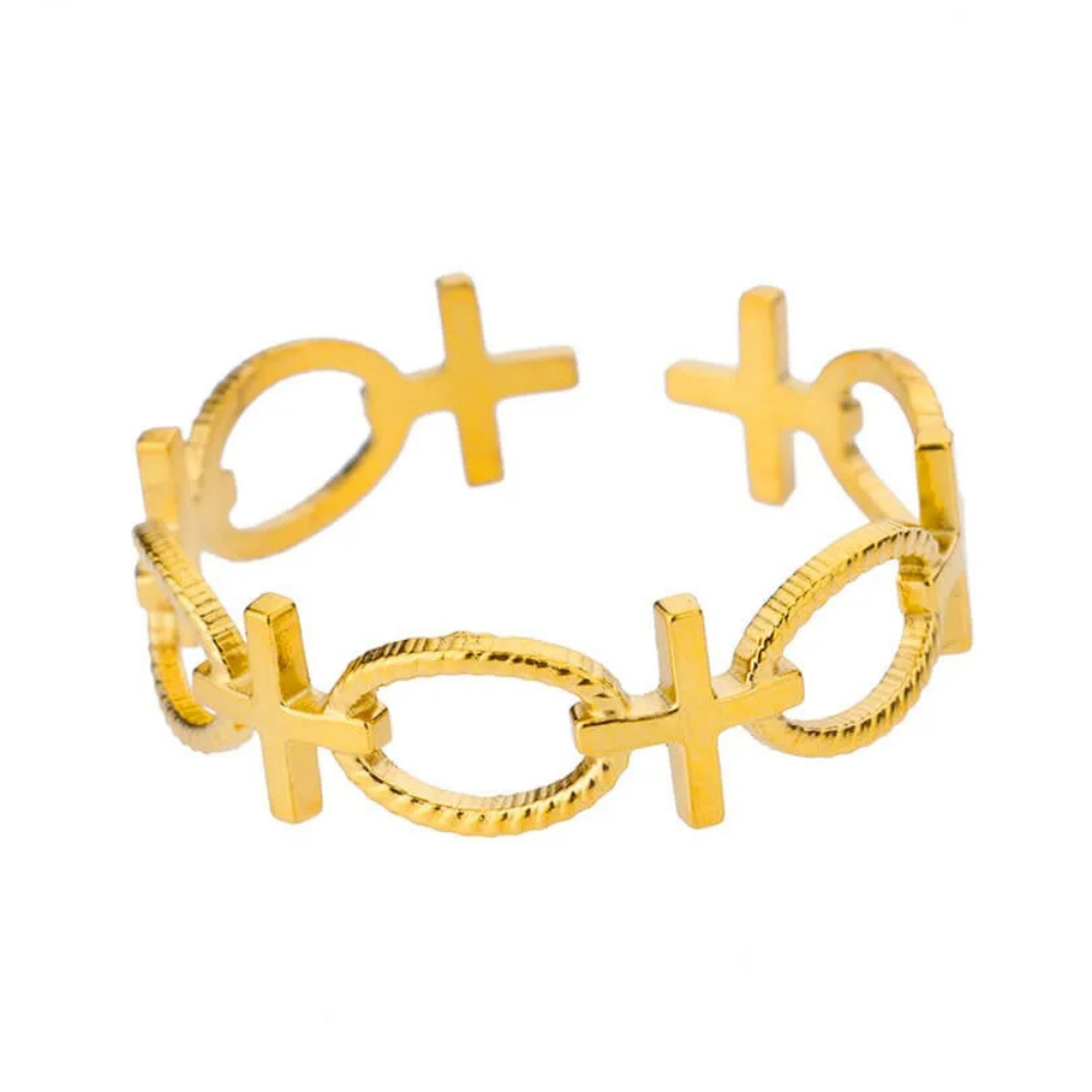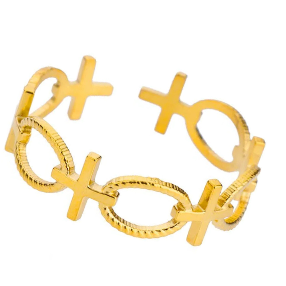 Un message symbolique fort s’exprime à travers notre séduisante bague croix style poisson. Elle alterne croix et symboles du poisson, tous découpés dans de l'acier inoxydable doré, formant un anneau souple et rythmé. Les détails en relief sur les poissons ajoutent de la texture. La conception ouverte permet une mise en place super simple.
