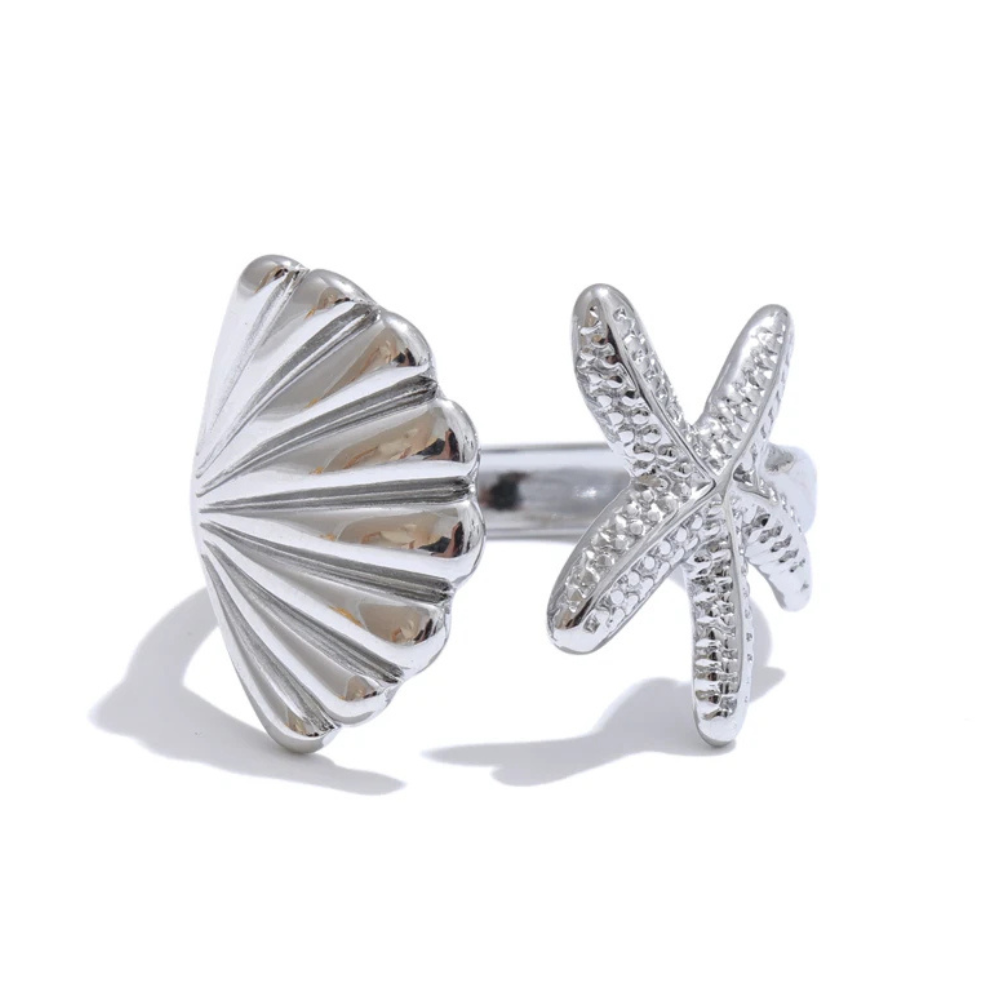 Portez la summer vibe jusqu'au bout des doigts avec notre superbe bague ouverte avec coquillage et étoile de mer !