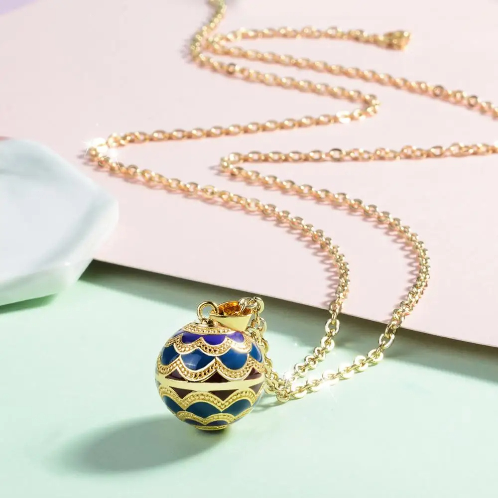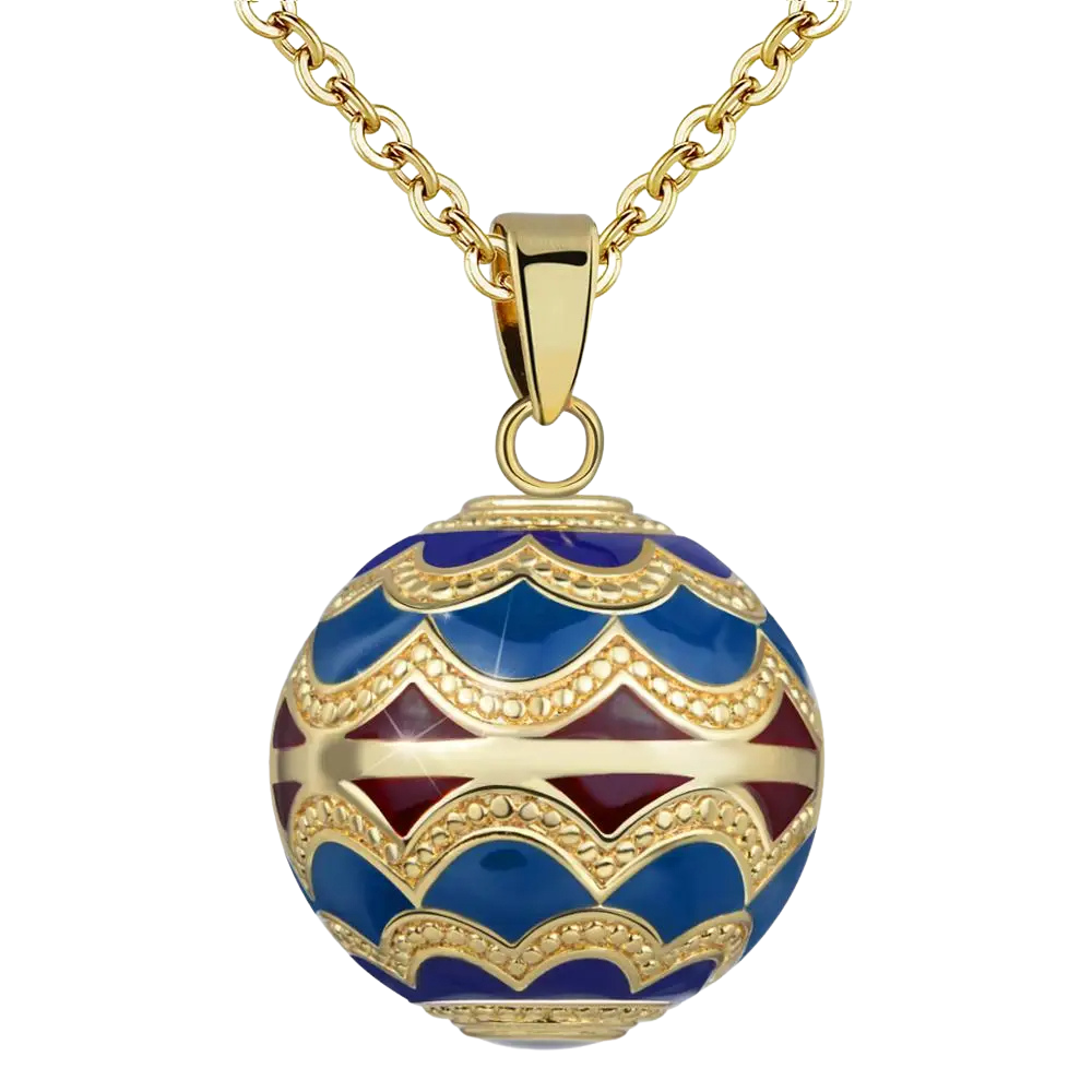 Un design inspiré des vagues habille notre splendide bola de grossesse style ancien, aux couleurs contrastées : bleu intense, rouge profond et doré. Sa forme arrondie met en valeur la répétition de ses motifs géométriques, évoquant rythme et harmonie. Le doux carillon qui s’en dégage favorise la détente et crée un lien sonore fort avec le bébé.