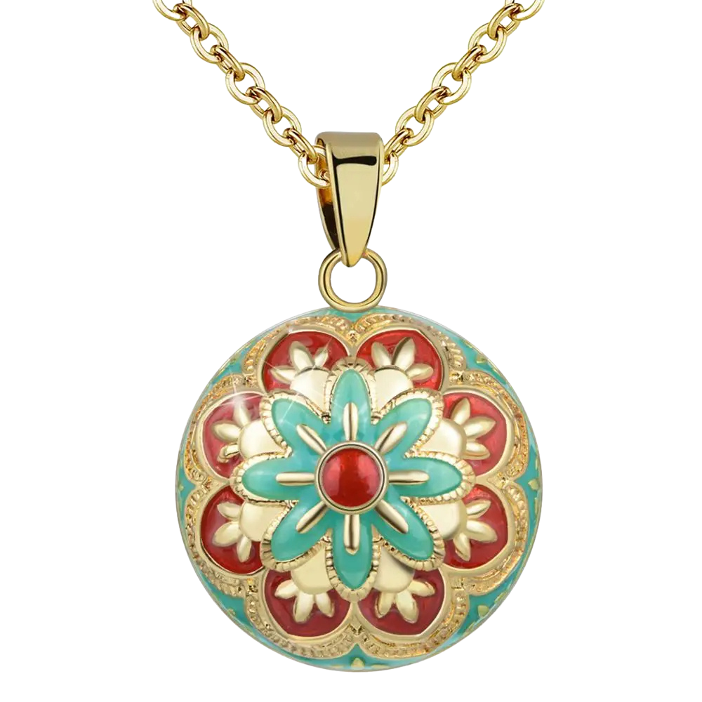 Un véritable tableau miniature se cache sur notre splendide bola de grossesse turquoise, où le rouge chaleureux s’entrelace au bleu éclatant. Le motif floral central, souligné de doré, apporte une touche artistique et colorée. Fabriqué avec soin, il diffuse un son apaisant à chaque mouvement. Ce pendentif devient un compagnon précieux pour créer une atmosphère sereine avec bébé.