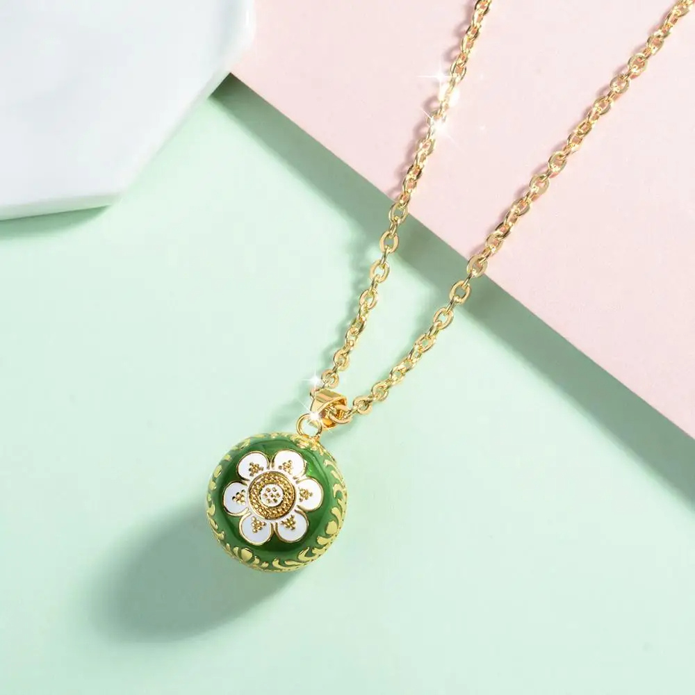 Notre ravissant bola de grossesse couleur vert met en avant une jolie fleur blanche centrale entourée d’accents dorés. Les détails ciselés offrent un charme authentique et harmonieux. Pensé comme un bijou protecteur, il émet une sonorité douce qui apaise et réconforte l’enfant à naître, tout en sublimant la silhouette de la future maman.