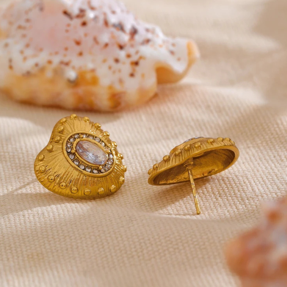 Apportez de l’éclat à votre style avec ces boucles d'oreilles coeur doré strass, un modèle lumineux qui attire immédiatement le regard grâce à son relief travaillé et à sa pierre centrale scintillante. Leur silhouette généreuse, rehaussée d’une finition dorée texturée, évoque un bijou précieux au charme solaire. Le contour serti de petits strass met encore davantage en valeur la pierre ovale au centre, pour un rendu chic, féminin et très élégant.