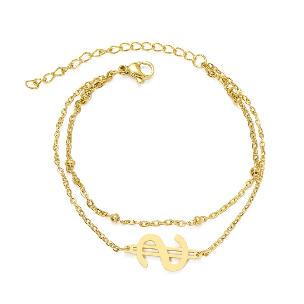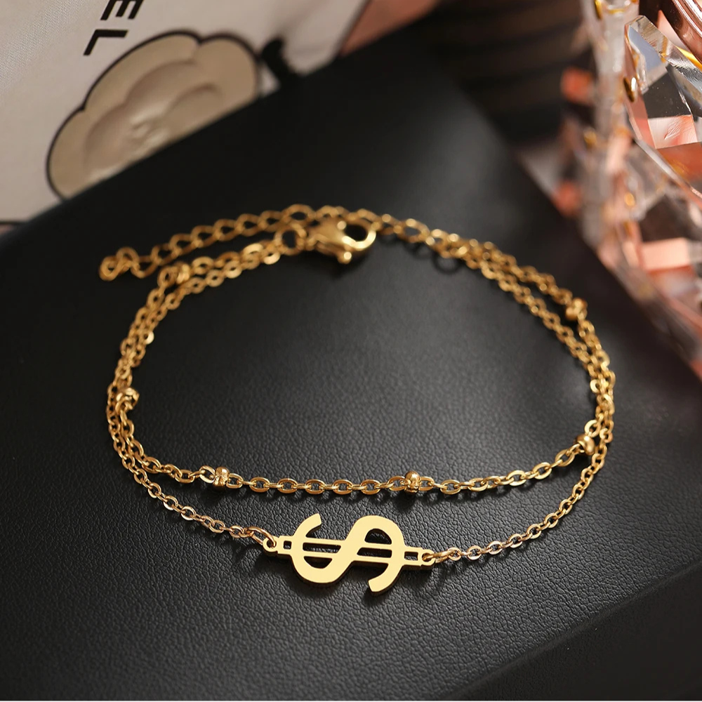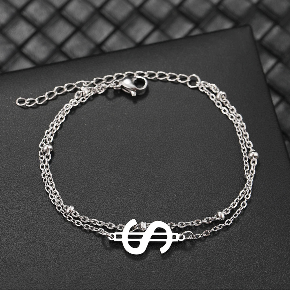 Ce bracelet dollar femme est conçu pour celles qui veulent exprimer une énergie ambitieuse 💎. Son pendentif en forme de dollar s'accompagne d'une double chaîne raffinée, offrant une allure distinctive. Disponible en finition dorée ou argentée, ce bijou en acier inoxydable résiste à l'eau et au temps.