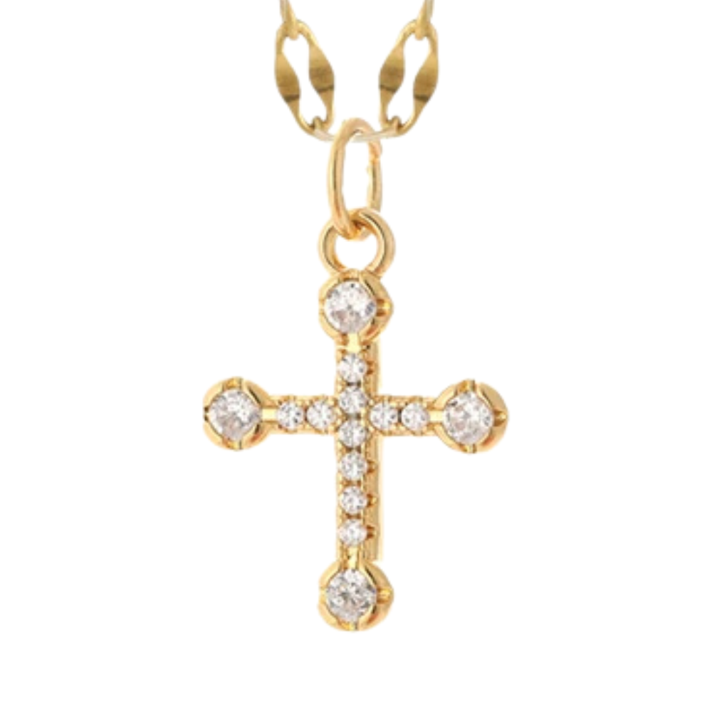 La délicatesse au bout de votre chaîne, grâce à notre splendide collier avec croix en cristaux. Ce petit pendentif croix doré arbore des zircons finement sertis, offrant une brillance délicatement contrastée par le métal doré. Ses extrémités arrondies confèrent une douceur particulière au design, tandis que son petit format en fait un bijou facile à porter au quotidien, symbole parfait de spiritualité raffinée et sobre.
