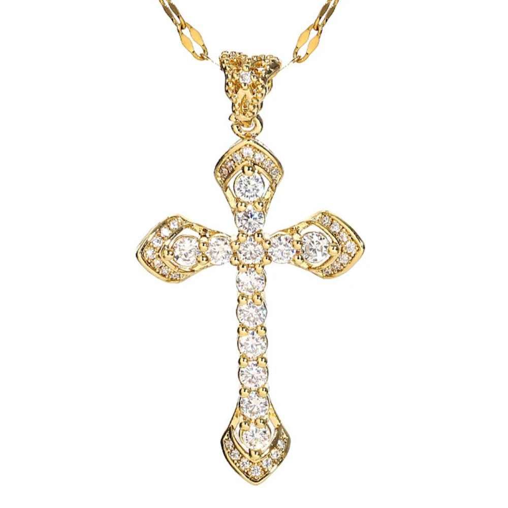 Jetez votre dévolu sur notre formidable collier avec croix en diamant, exceptionnellement bien travaillé. Cette croix dorée possède un design sophistiqué où des zircons blancs ronds apportent un éclat remarquable. Les détails dorés finement sculptés sur chaque branche accentuent le prestige de ce bijou, idéal pour souligner l'élégance naturelle de celle ou celui qui le porte.
