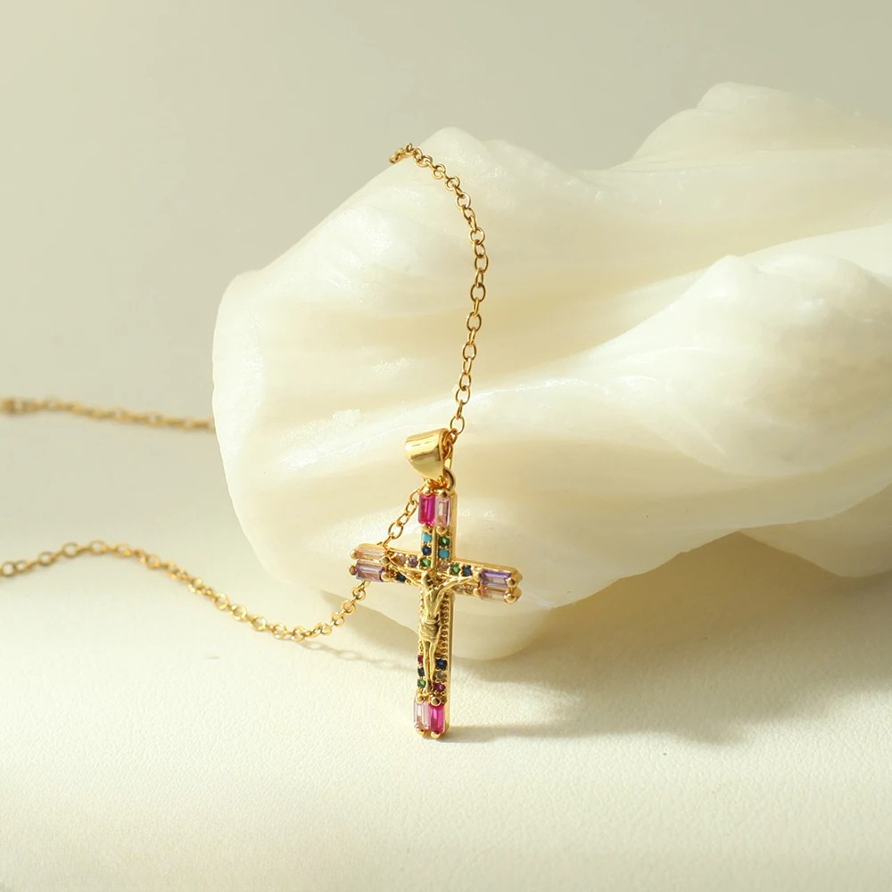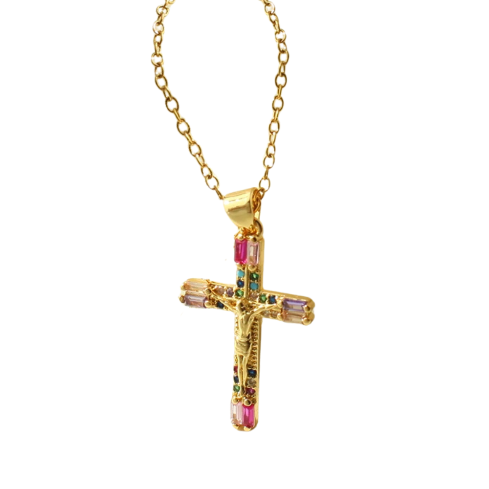 Découvrez notre resplendissant collier avec croix multicolore représentant Jésus, un bijou ou religion et élégance se rejoignent. Ce pendentif doré présente une silhouette religieuse délicatement sculptée, entourée de zircons colorés aux tons roses, verts, violets et bleus. Une pièce aux couleurs vibrantes, mêlant spiritualité et charme.