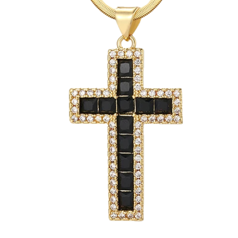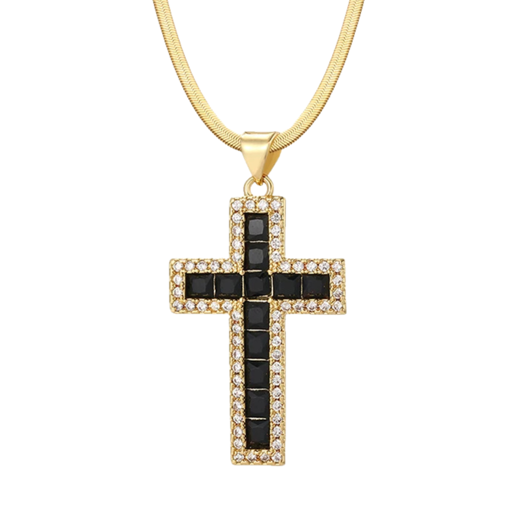 La sophistication du contraste noir-or est de mise avec notre radieux collier avec croix en zircon noir ! Ce pendentif en forme de croix présente des pierres noires carrées soigneusement disposées au centre, encadrées par un contour doré finement décoré de cristaux blancs étincelants. Le jeu de contraste entre la profondeur du noir et l’éclat du doré lui donne une apparence chic et moderne.