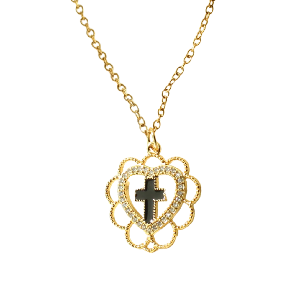 Affirmez votre amour pour le christianisme avec notre resplendissant collier avec croix noir encerclé d'un cœur. Ce pendentif en forme de cœur doré dévoile une croix noire centrale, sublimée par une bordure de zircons blancs scintillants. Les détails ajourés autour ajoutent une touche raffinée et moderne à ce bijou.