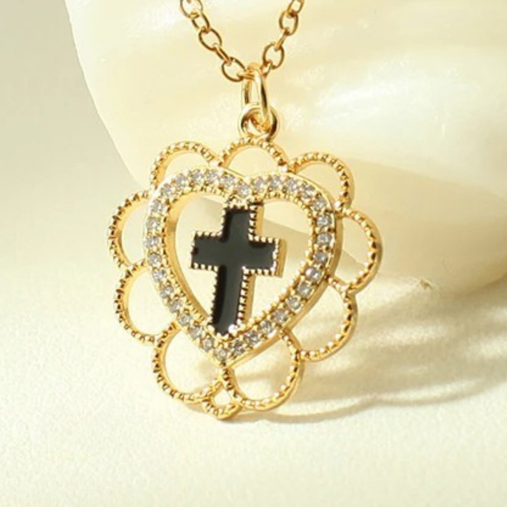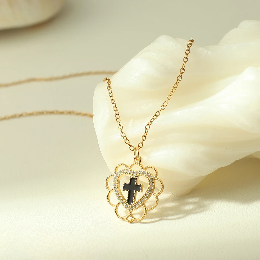 Vivez pleinement votre spiritualité avec notre adorable collier avec croix noire dans un cœur !