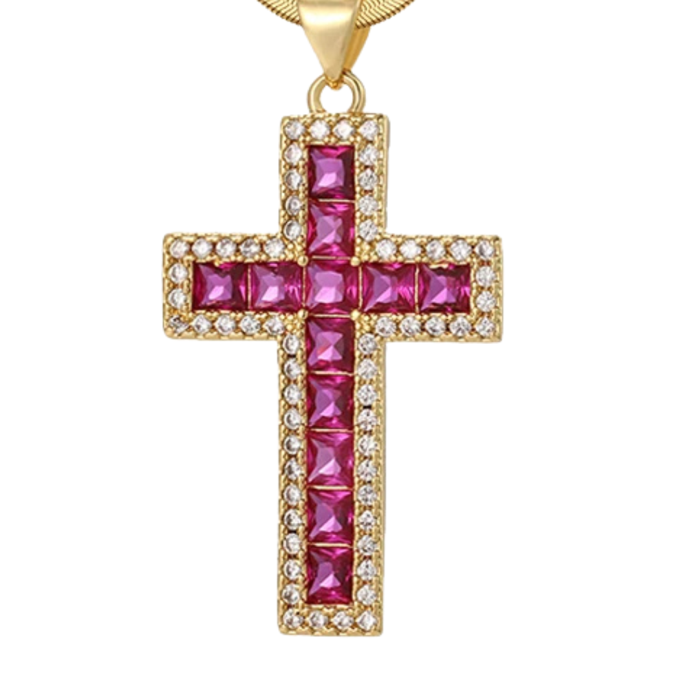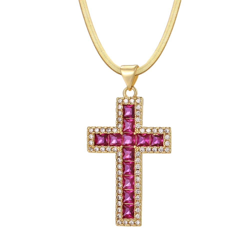 Affirmez votre spiritualité avec passion avec notre extraordinaire collier croix en cristaux rose fuchsia. Ce pendentif croix se distingue par ses magnifiques pierres de coupe carrée, entourées par une fine bordure de zircons blancs éclatants. La combinaison audacieuse de l’or et du rose vibrant rend ce bijou marquant et mémorable, idéal pour celles et ceux qui aiment l’intensité.
