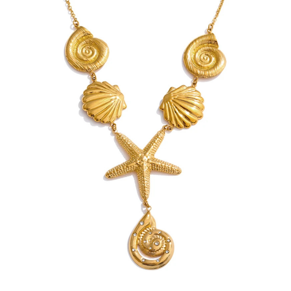 Affirmez votre amour pour la mer avec notre magnifique collier en y doré composé de coquillages, d'une étoile de mer centrale, finement sculptés en acier inoxydable. Chaque pièce présente des détails réalistes, notamment des rainures précises qui imitent parfaitement les textures naturelles. Une spirale ornée de petits cristaux ajoute une subtile touche brillante, faisant de ce bijou un choix à la fois chic et authentique.