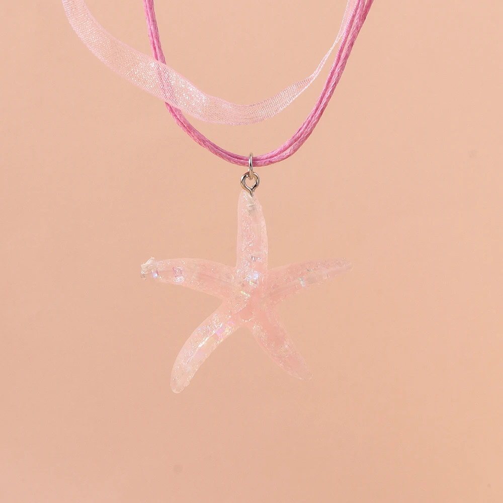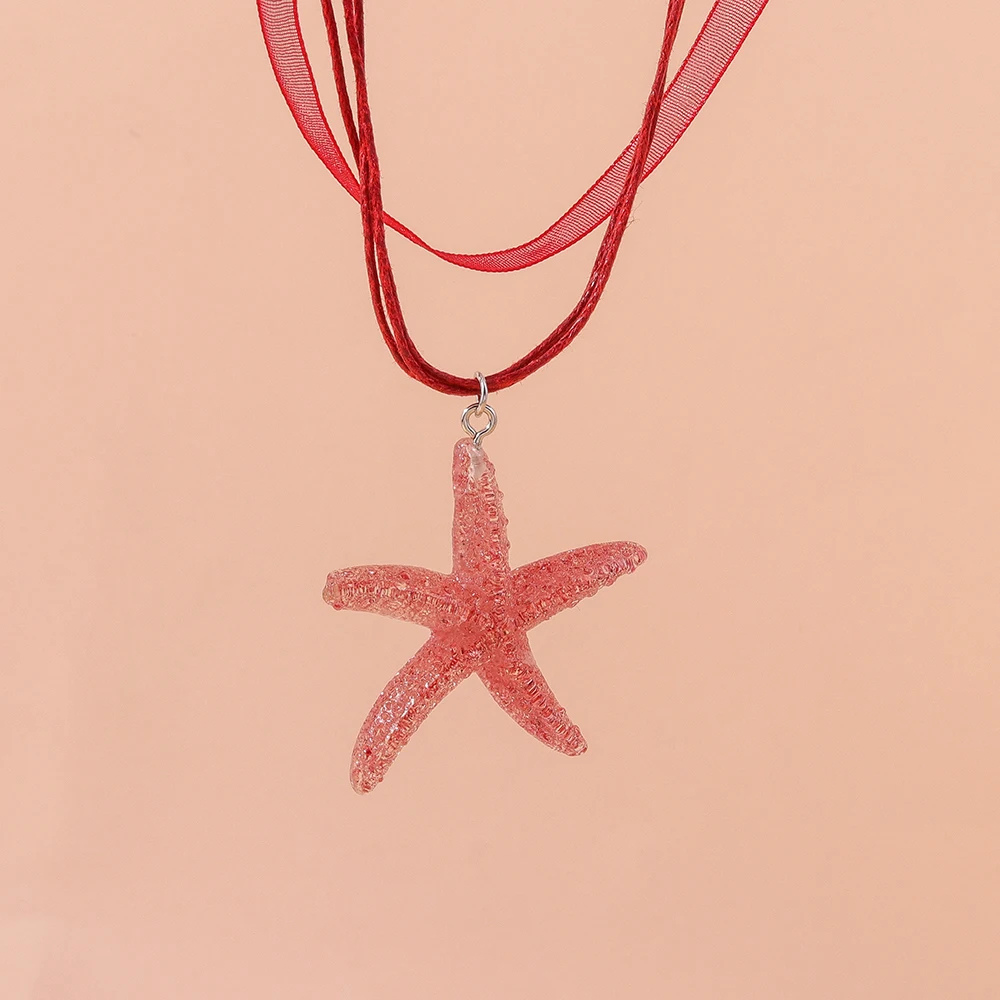 Grâce à notre charmant collier avec étoile de mer fantaisie, couleurs vives et textures brillantes pour un effet waouh garanti. Ce collier présente un ruban satiné (rouge, violet, turquoise, etc.) associé à une étoile translucide en résine contenant des paillettes dorées ou colorées. Le rendu est vivant, festif, parfait pour attirer le regard.