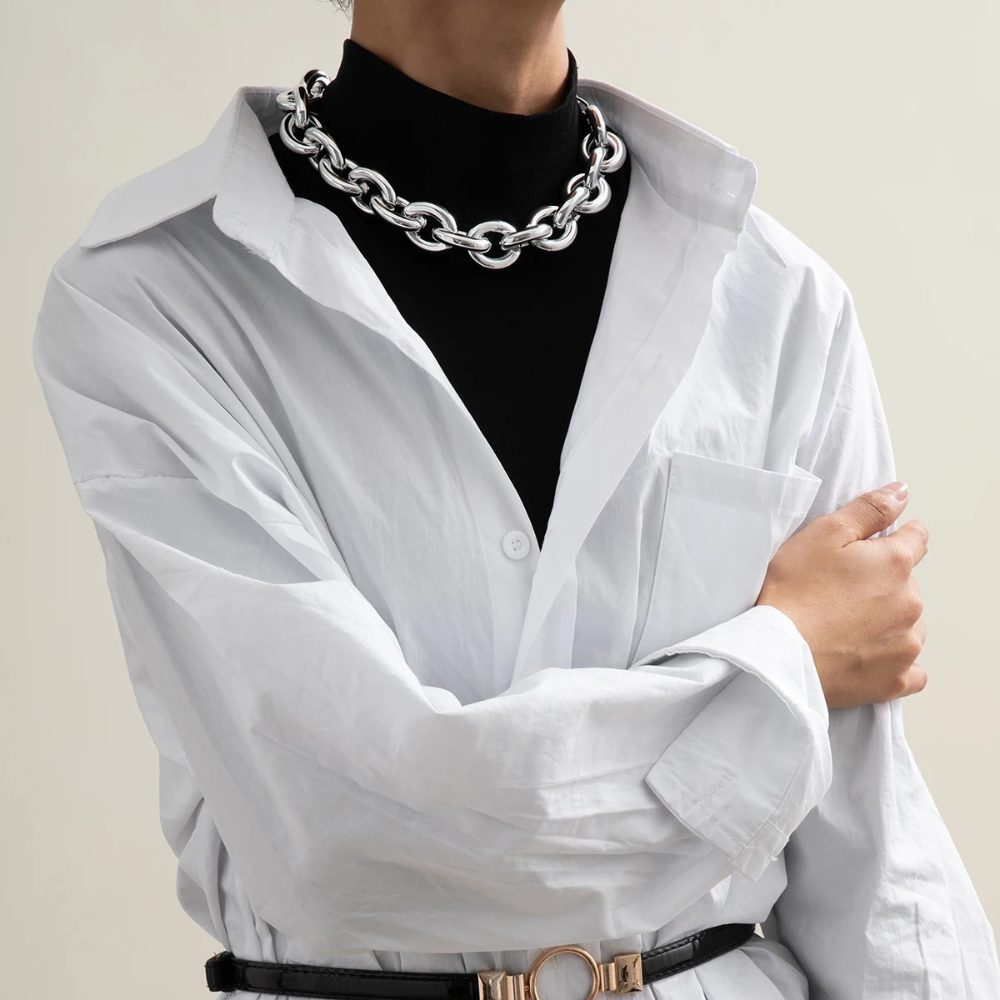 Osez une touche d'extravagance en portant notre fabuleux collier en grosse maille de couleur argent !