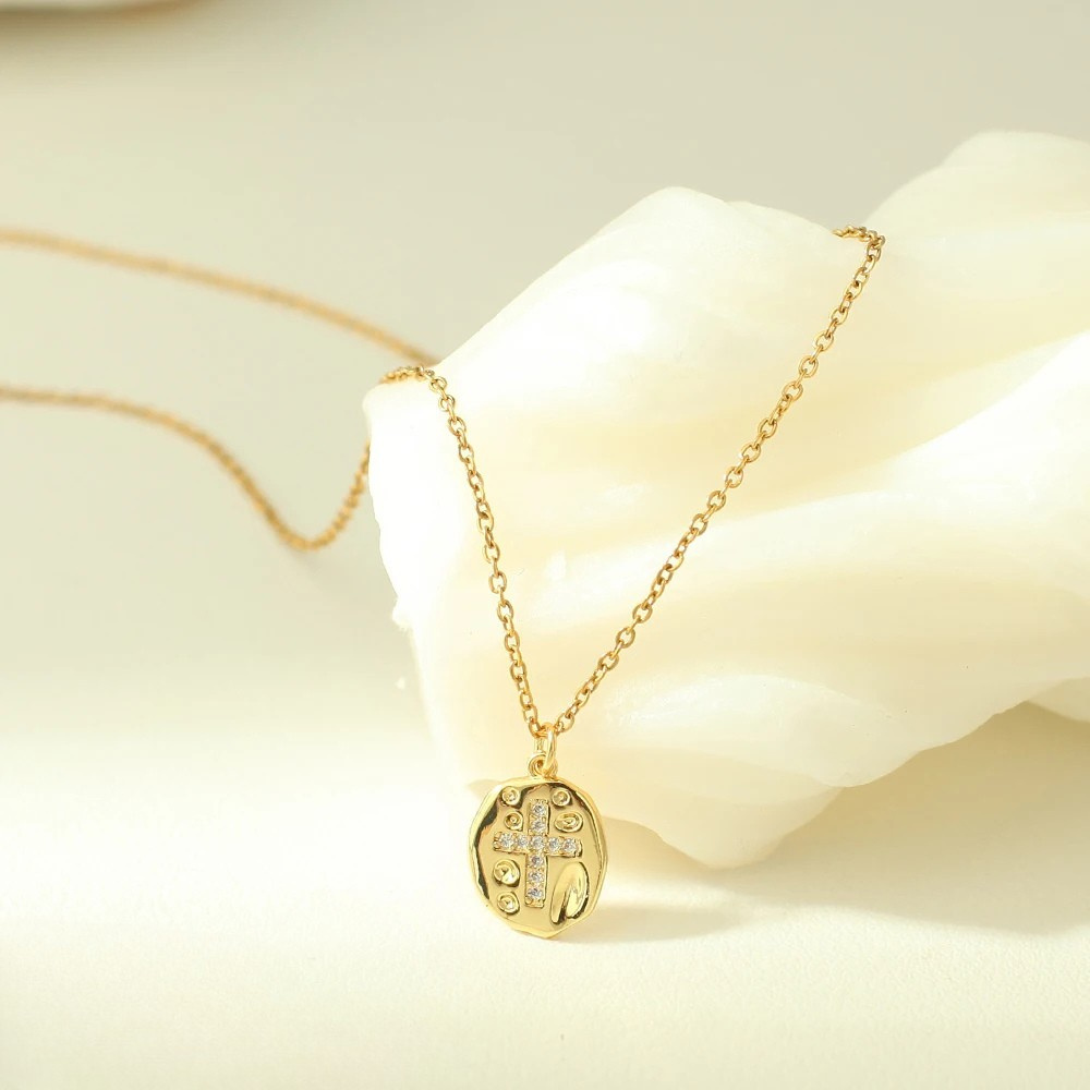 Un collier avec médaille sertie d'une croix, au caractère authentique ! Ce pendentif doré à la forme légèrement irrégulière porte une croix centrale ornée de zircons blancs. Les motifs gravés qui l'entourent ajoutent du relief et un aspect artisanal, pour un bijou empreint de charme et d'authenticité.