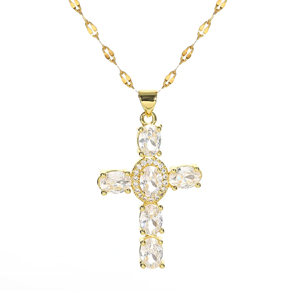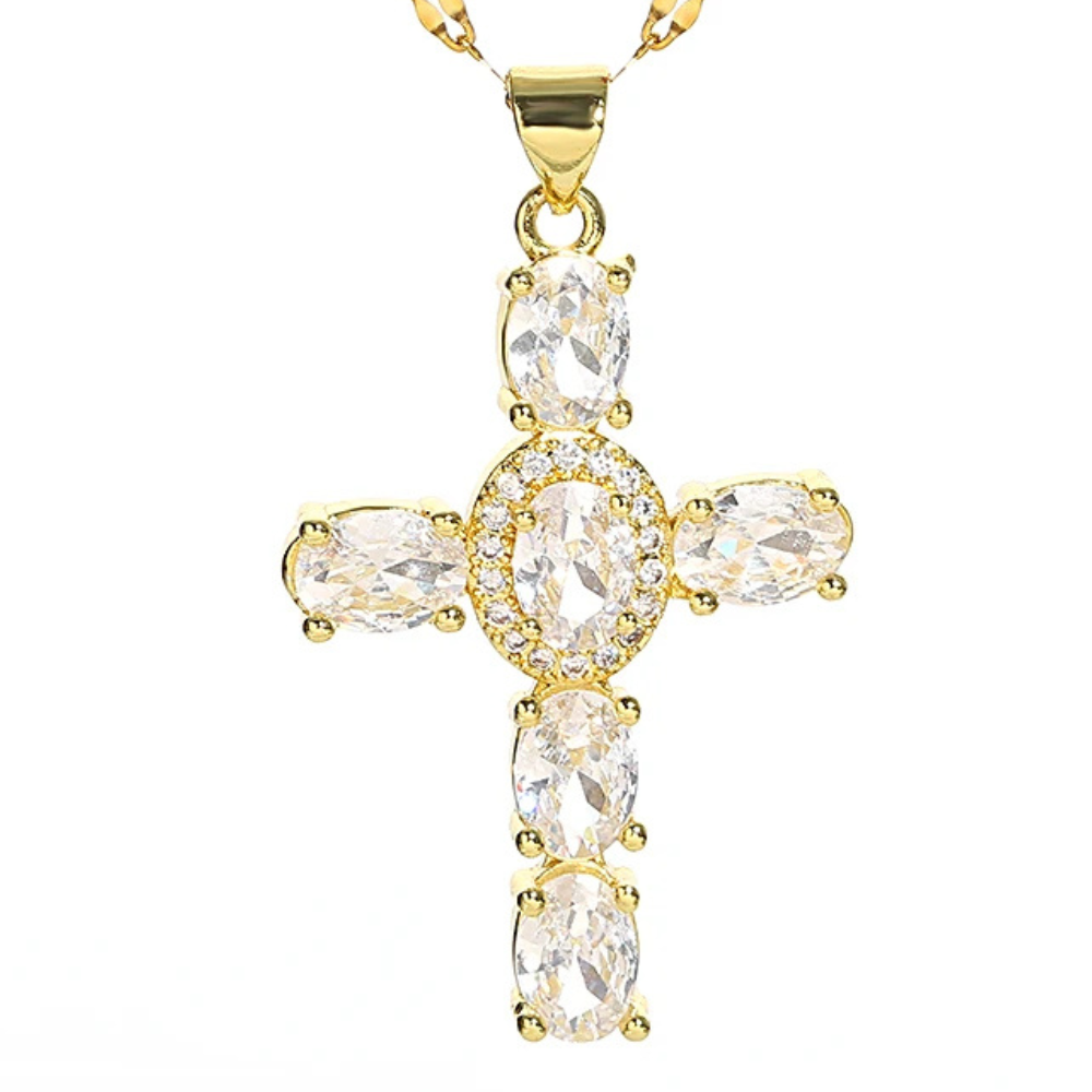 Un bijou au charme intemporel, c'est ce que vous promet notre exceptionnel collier avec pendentif croix blanche. Cette belle croix dorée est serti de pierres transparentes ovales, encadrées d'un éclat or brillant. Son cœur central composé de petits zircons brillants accentue la luminosité générale du bijou. La structure harmonieuse de la croix met en valeur son aspect raffiné et élégant.