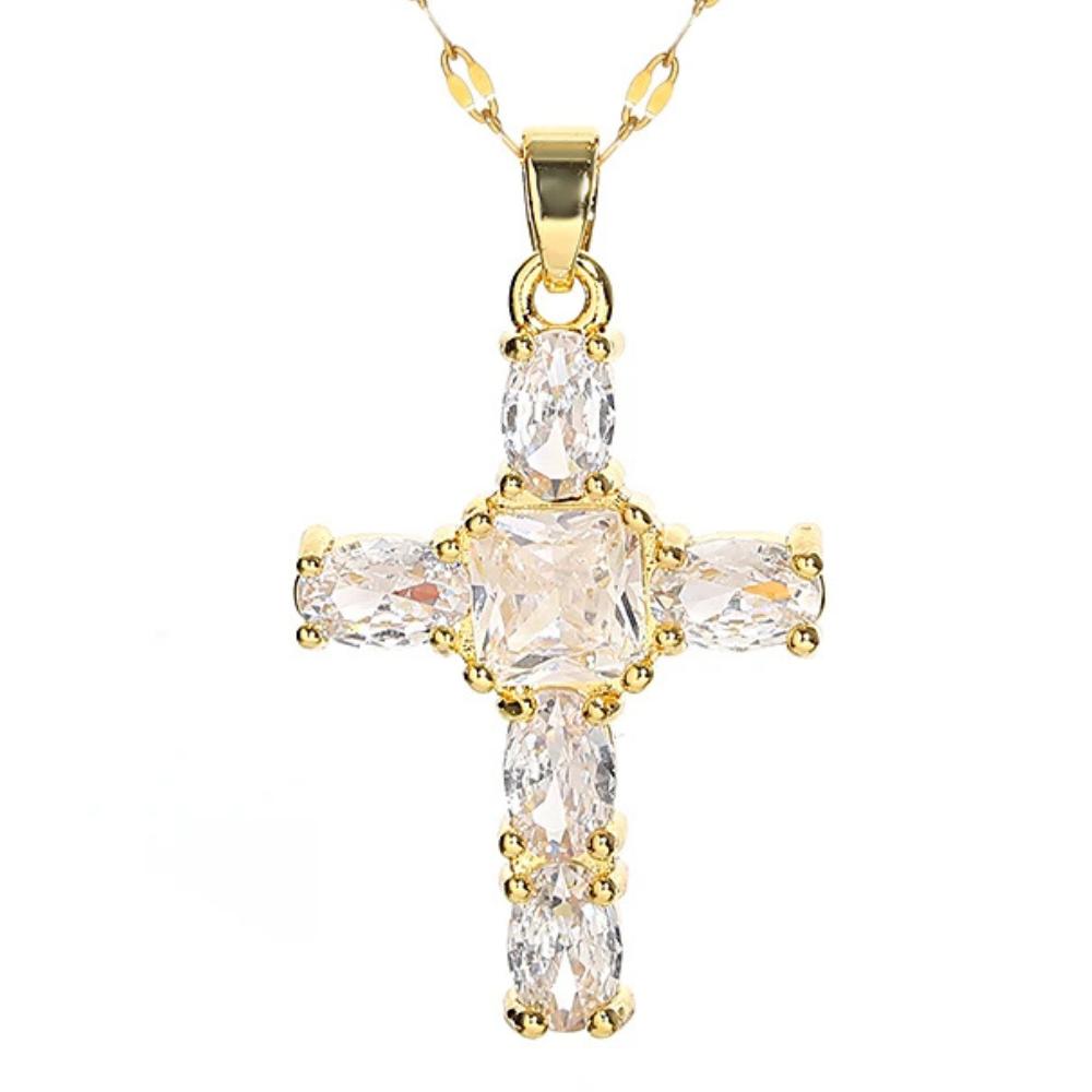 Craquez pour notre incroyable collier avec pendentif croix en zircon, un bijou lumineux qui ne passe pas inaperçu. Cette croix dorée est ornée d'une pierre centrale carrée et de pierres ovales transparentes sur chaque branche. Son style moderne, associé à une brillance éclatante, rend cette croix particulièrement élégante et captivante.
