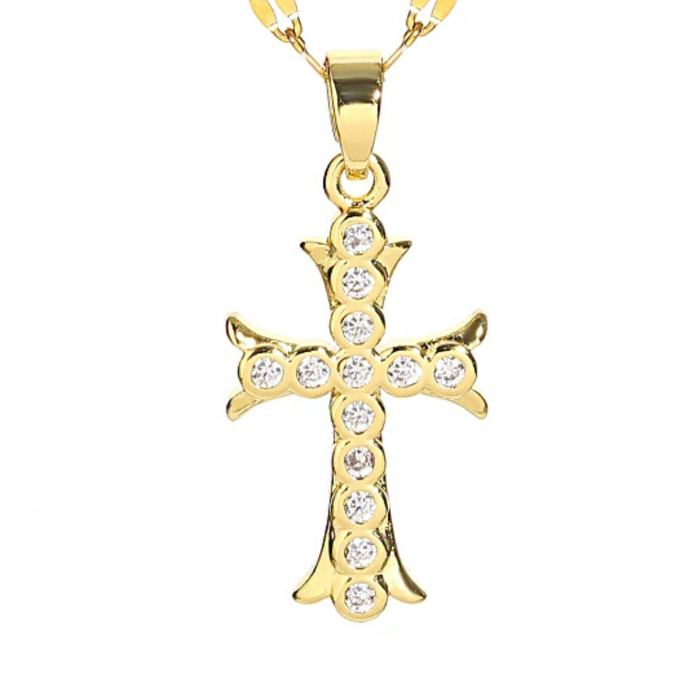 La pureté dans sa forme la plus élégante grâce à notre sensationnel collier avec petite croix en cristaux. Ce collier arbore une croix dorée délicatement sertie de zircons ronds blancs. Sa forme légèrement évasée aux extrémités crée une apparence particulièrement gracieuse et traditionnelle, apportant une touche de finesse discrète à chaque instant.