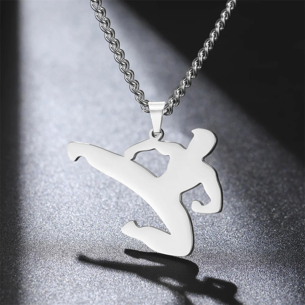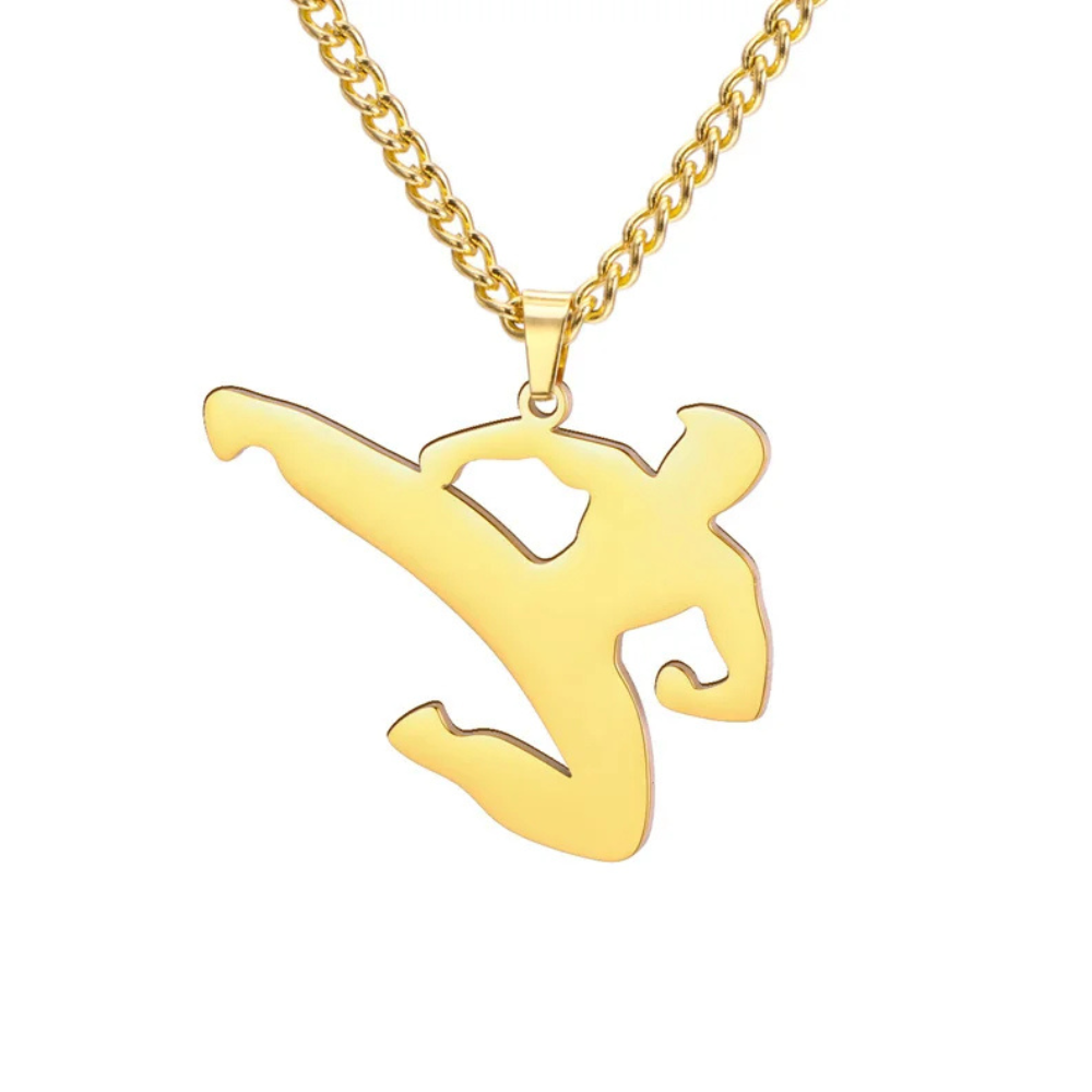 Exprimer la passion pour les arts martiaux avec ce collier Taekwondo en acier inoxydable 🥋. Conçu pour les pratiquants et les amateurs de cette discipline, ce pendentif représente un combattant en plein coup de pied, symbole de puissance et de maîtrise. Disponible en or ou en argent, ce bijou résiste à l'usure et ne ternit pas avec le temps.