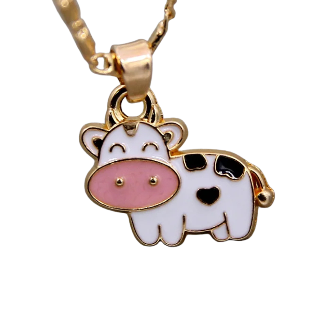 - Pendentif vache : motif mignon avec émail blanc et noir, accentué par une touche de rose