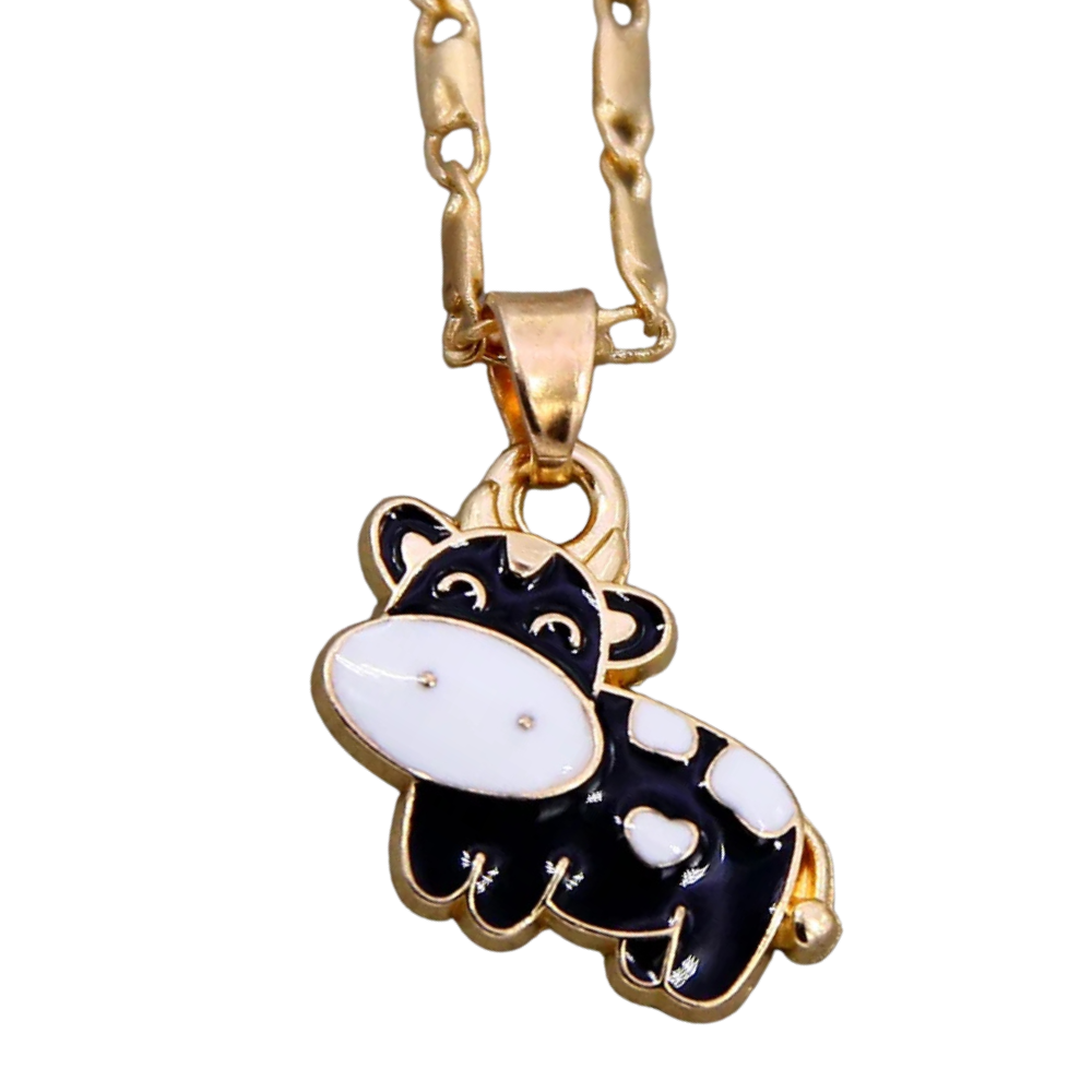 - Pendentif vache : émail noir et blanc, avec des détails dorés