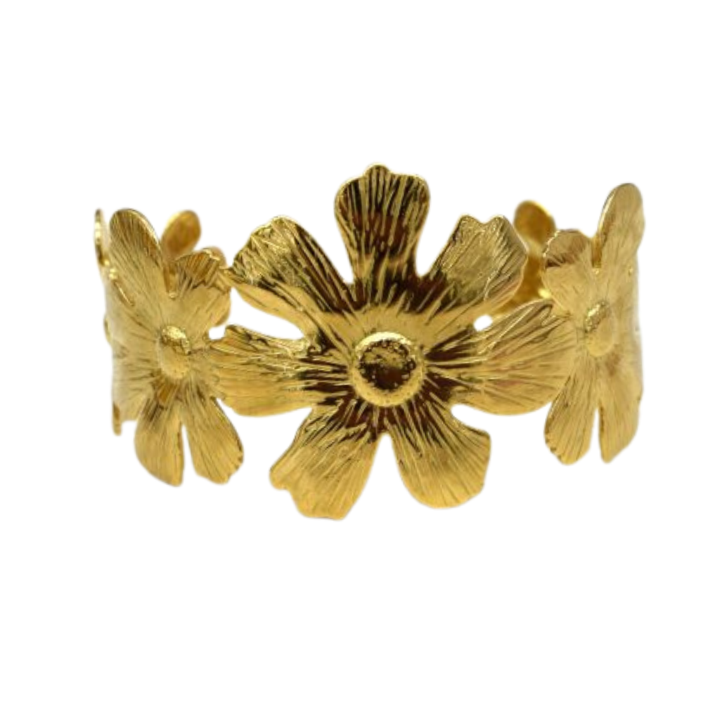 Élégant et intemporel, notre éclatant jonc à fleur couleur or, de style manchette, se distingue par ses fleurs délicatement sculptées. Chaque pétale, finement texturé, semble prendre vie sous la lumière. Son design ajouré épouse parfaitement le poignet et apporte une touche de peps naturelle. Un bijou qui incarne à merveille la féminité et la délicatesse.