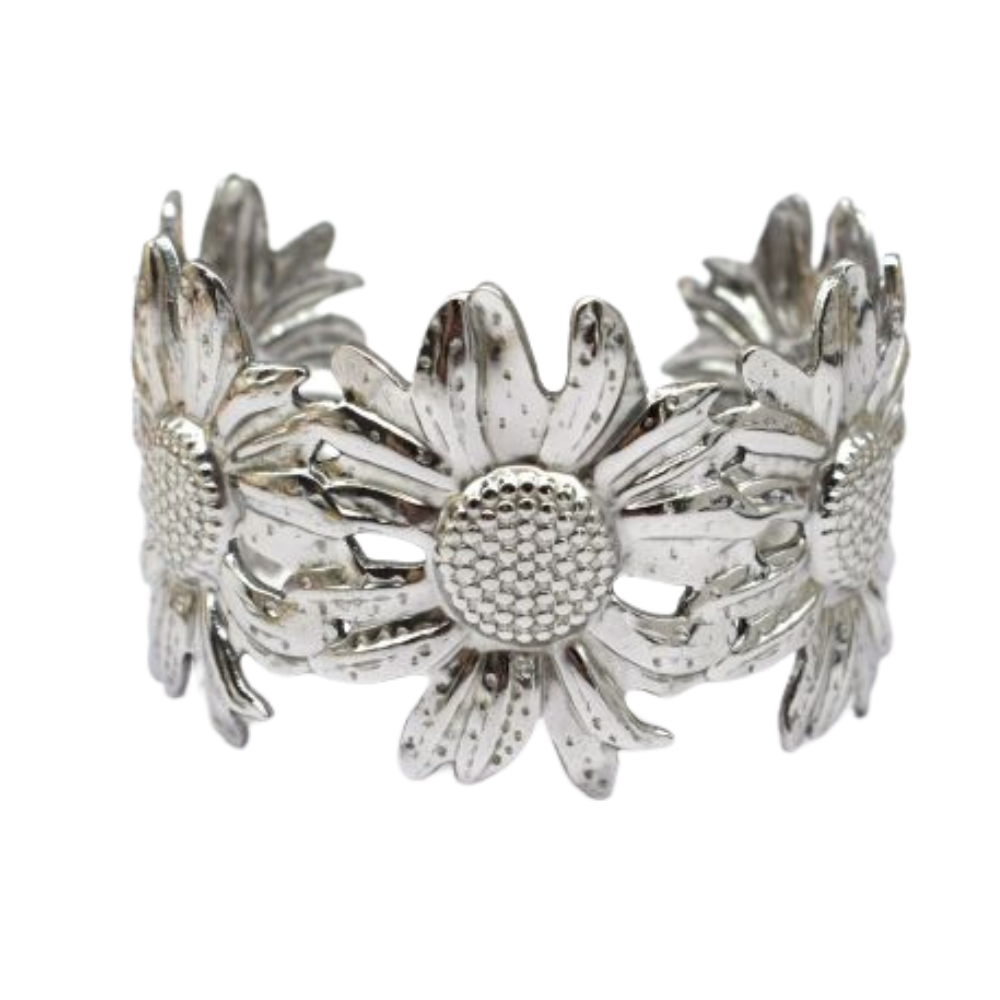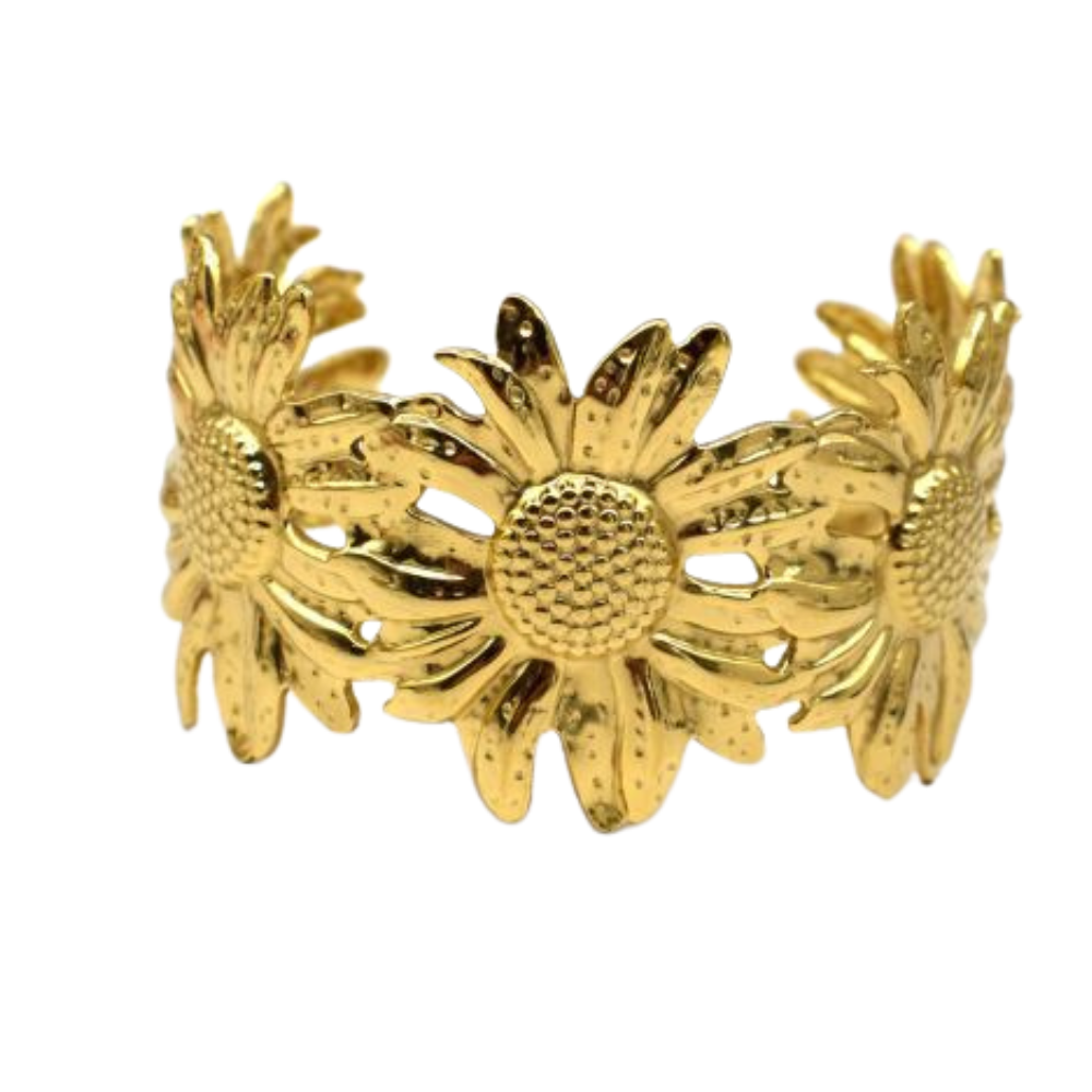 Notre formidable jonc avec fleur pâquerette respire la chaleur et la vitalité. Ses grandes fleurs aux cœurs texturés rappellent les rayons du soleil. Son éclat doré ou argenté illumine le poignet et sublime chaque geste. Audacieuse, mais élégante, cette création se porte aussi bien avec une tenue d’été qu’une robe chic. Un bijou rayonnant qui attire la lumière et les compliments.