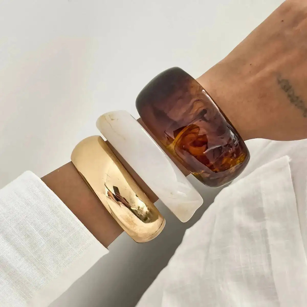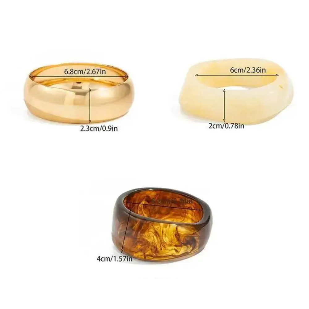 Misez sur l’effet “wow” sans effort avec ce set 3 bracelets manchettes pensé pour créer une accumulation harmonieuse et très actuelle. L’ensemble réunit trois styles complémentaires : une manchette dorée au rendu brillant, une manchette résine ivoire douce et lumineuse, et une manchette résine ambre aux reflets caramel marbrés. Portés ensemble, ils donnent un look bohème chic et sophistiqué ; séparément, chaque pièce devient un accessoire fort, facile à intégrer à votre dressing.